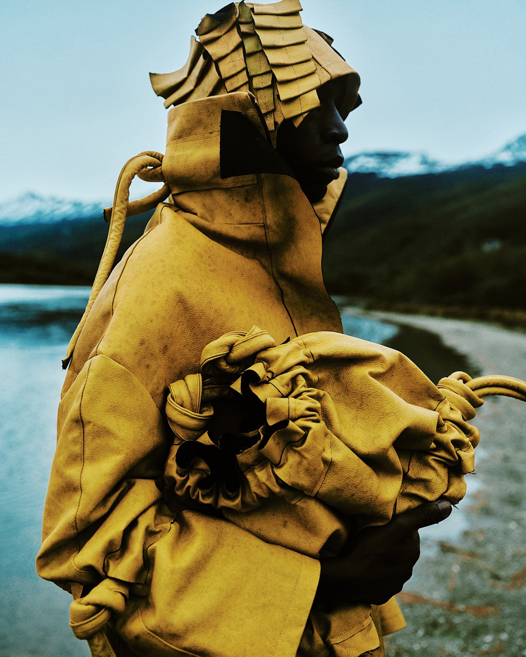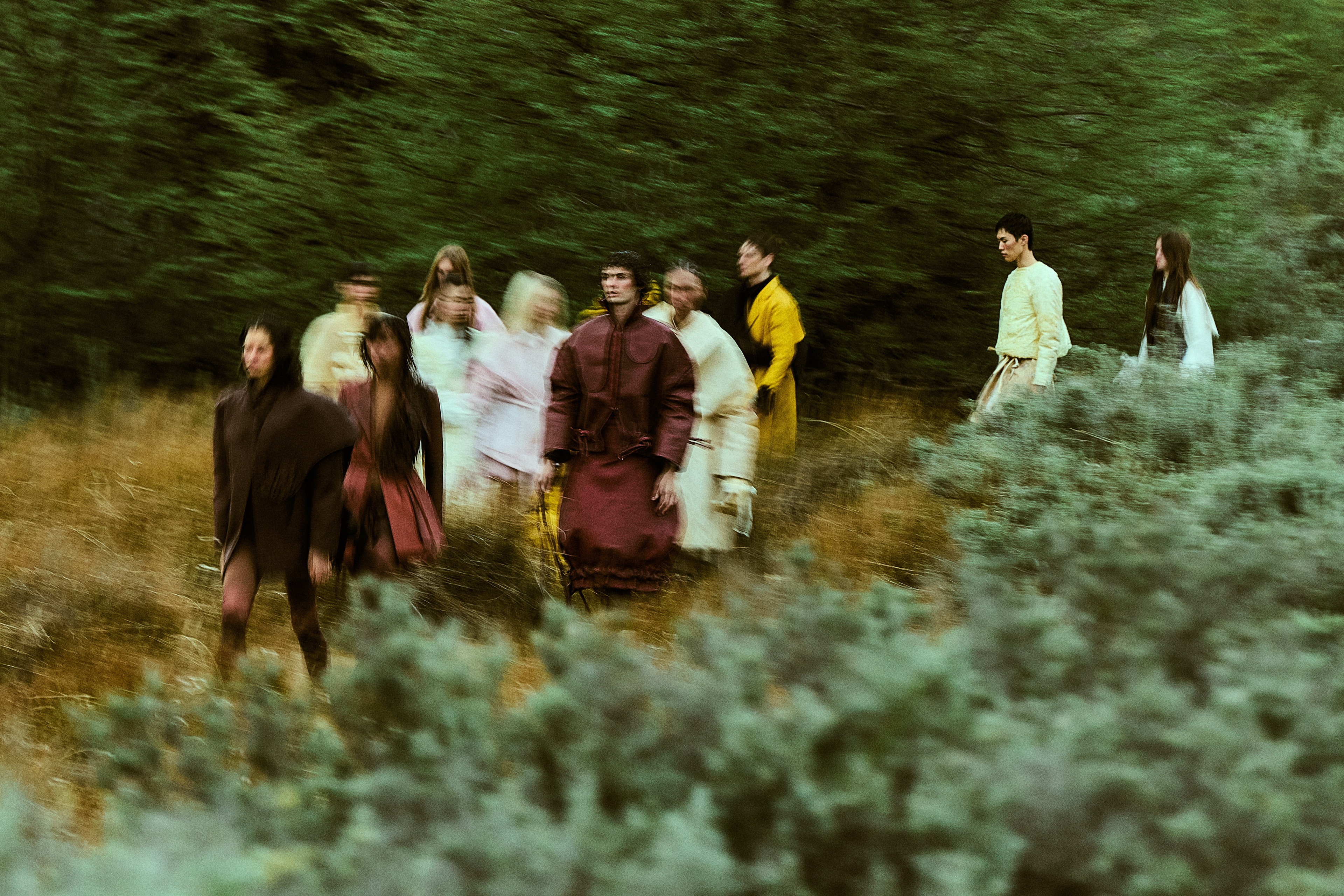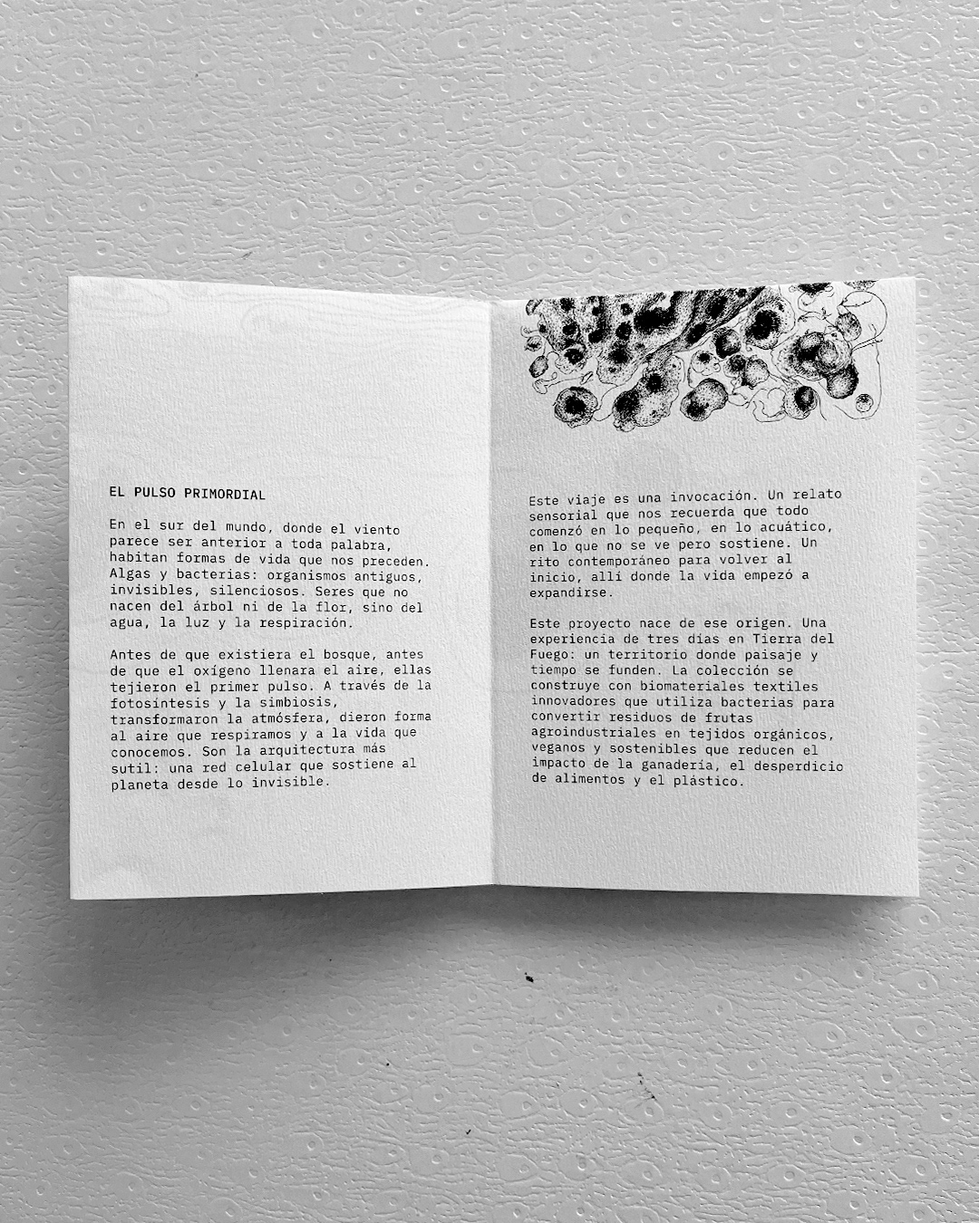 Este proyecto nace de ese origen. Una experiencia de tres días en Tierra del Fuego: un territorio donde paisaje y tiempo se funden. La colección se construye con biomateriales textiles innovadores que utiliza bacterias para convertir residuos de frutas agroindustriales en tejidos orgánicos, veganos y sostenibles que reducen el impacto de la ganadería, el desperdicio de alimentos y el plástico.
